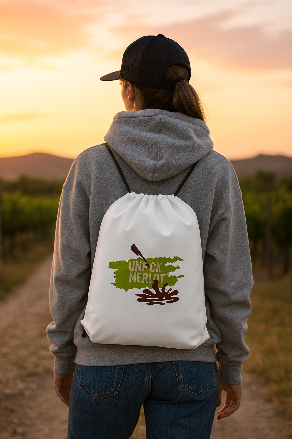 Inspired by the vineyard road-trips of Sideways, this drawstring bag is built for rebels on the move. Whether you’re sneaking a bottle past the snobs or just hauling your daily essentials, the bold UNF!CK MERLOT graphic makes sure your statement arrives before you do. Lightweight, durable, and unapologetically anti-snob — it’s the bag for those who’d rather wear rebellion than swirl it.